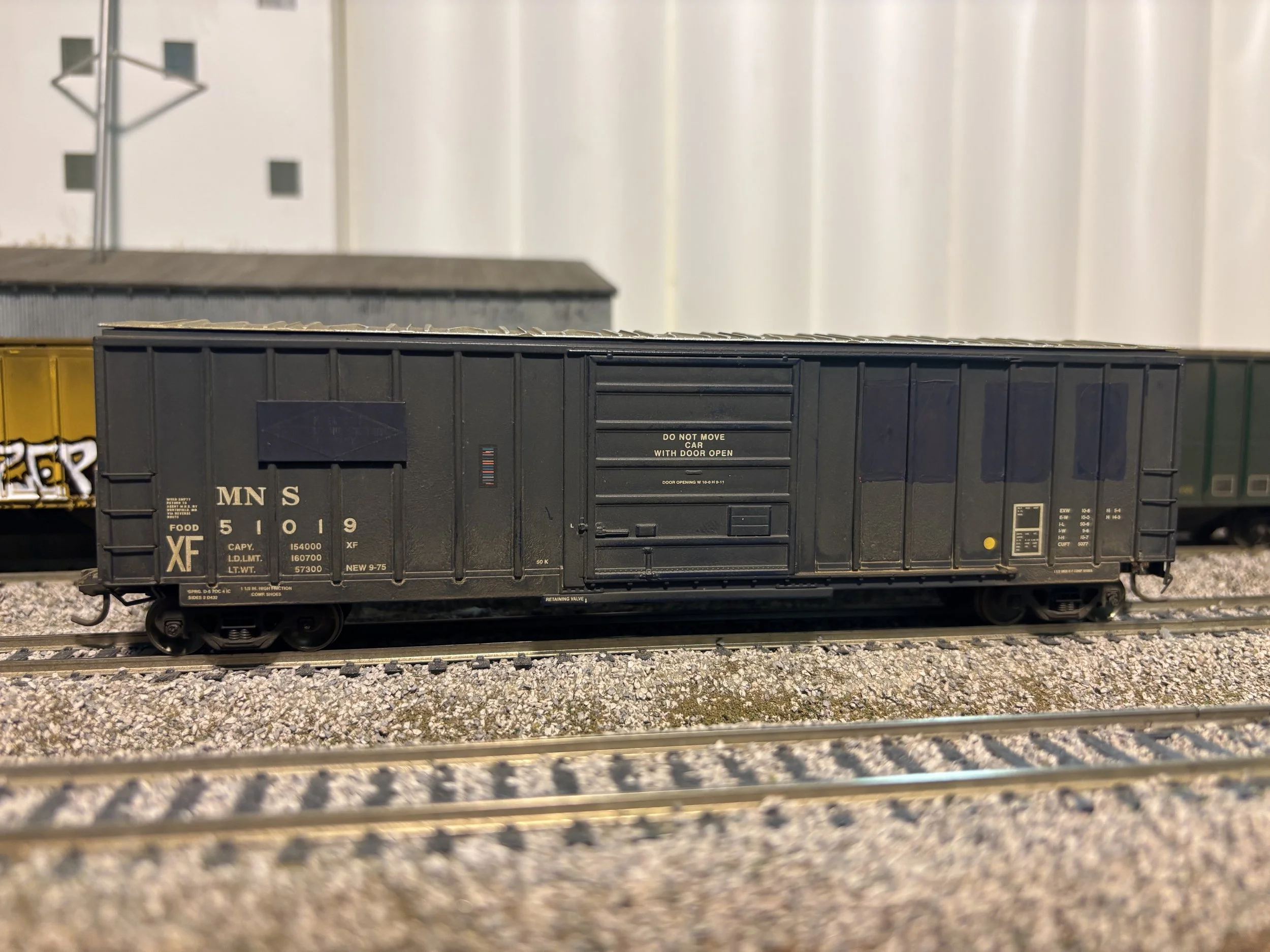 This MNS boxcar features layered grime, roof streaking, and hand-applied texture that captures the look of a real car in active service — not overdone, just authentic.